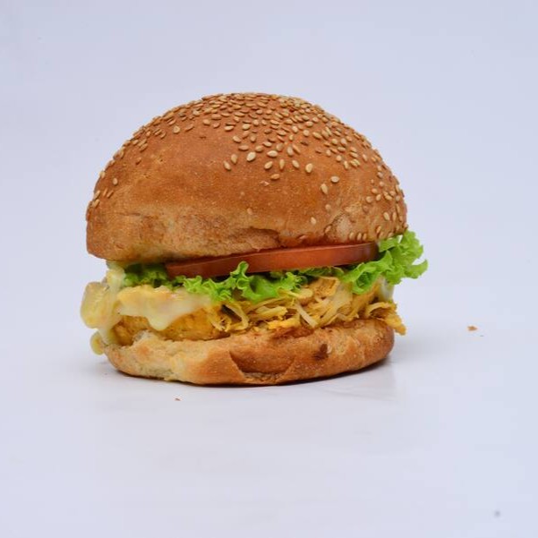 Pão de hambúrguer artesanal, frango desfiado, mussarela e salada.