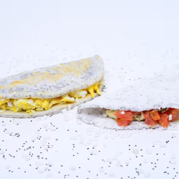 Massa de tapioca com clara de ovos e chia (sem glúten). Dê ainda mais sabor à sua crepioca adicionando deliciosos recheios!
