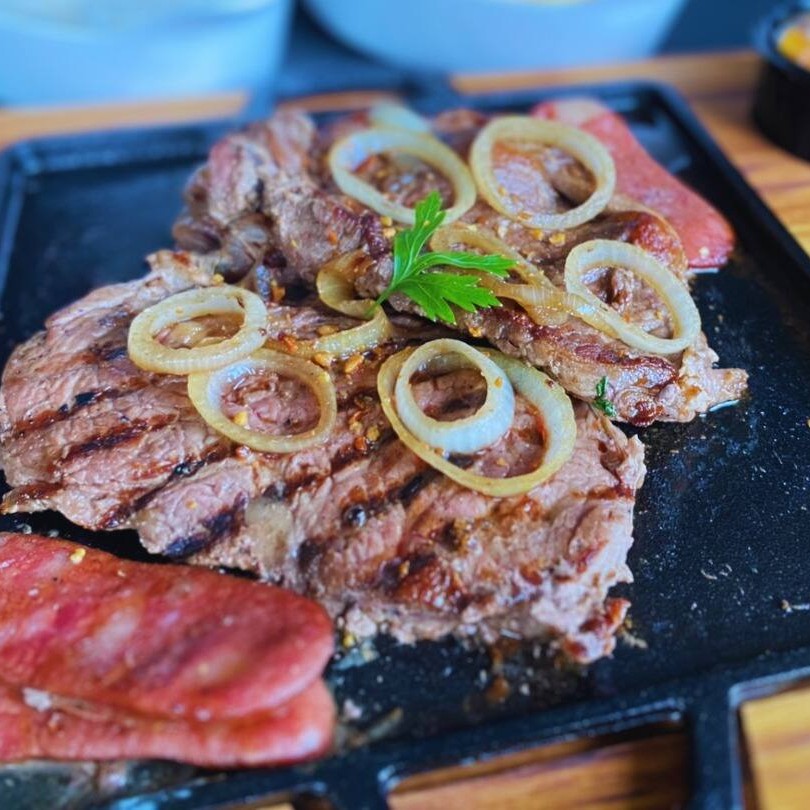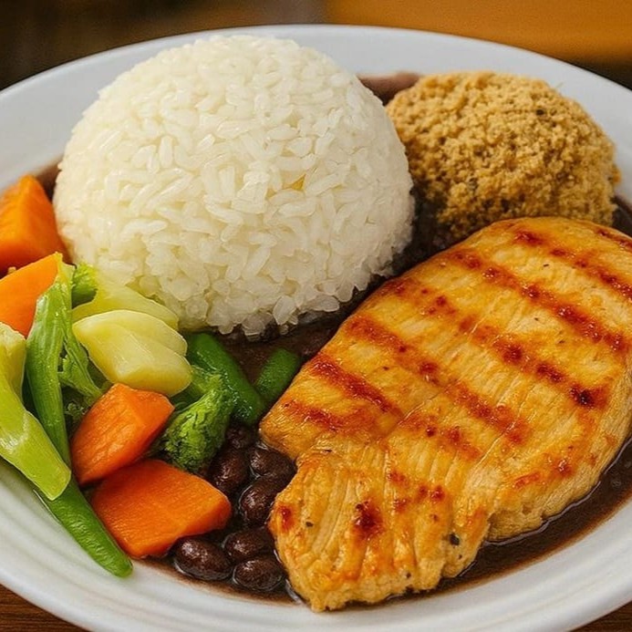 2 Bifes de Contra Filé Grill, duas fatias de Calabresa, arroz, feijão, fritas, farofa e vinagrete