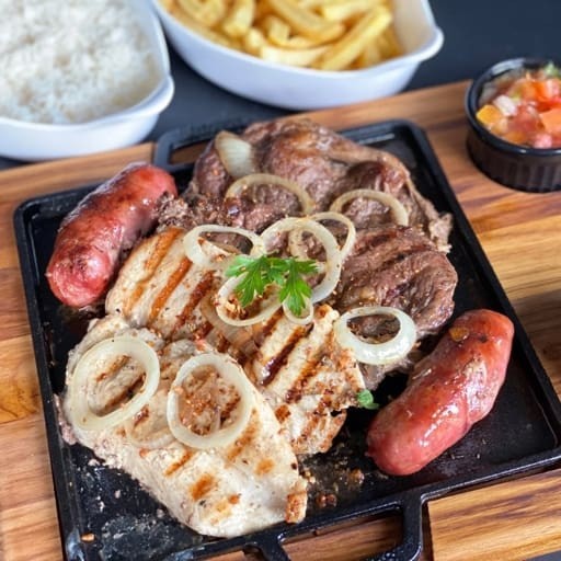 2 contrafilés , 2 peitos de frango, 2 linguiças toscana , acompanhados de arroz , fritas , feijão e vinagrete.