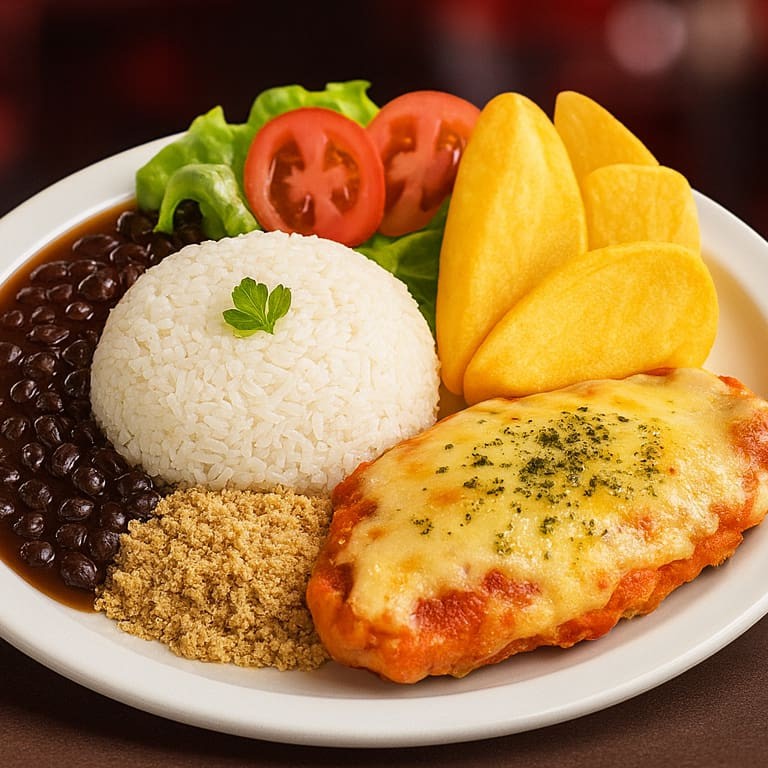 Deliciosa Parmegiana Com Molho Da Casa , Marmitex 750ml. Acompanha : Arroz , Feijão , Farofa , Batata Chips, Alface E Tomate. 1 Frango à Parmegiana Aproximadamente 120g.