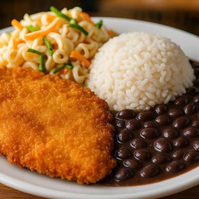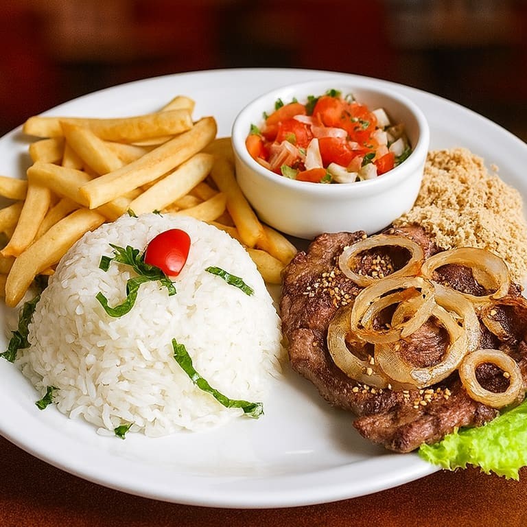 Acompanha : Arroz , Feijão , Fritas, Farofa Ou Tropeiro, Alface E Tomate Ou Vinagrete, 1 Bife.
