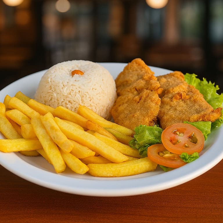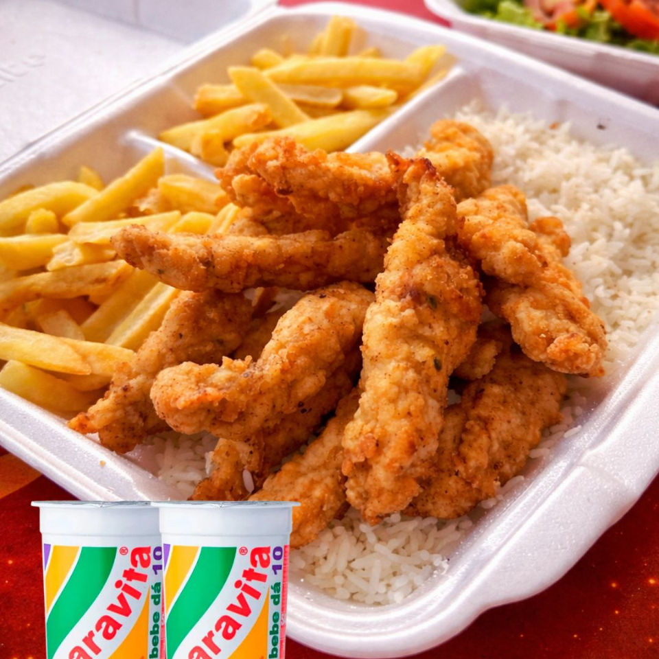 Arroz , Batata Frita , Salada de alface e tomate , Iscas de frango empanado. 2 guaravitas