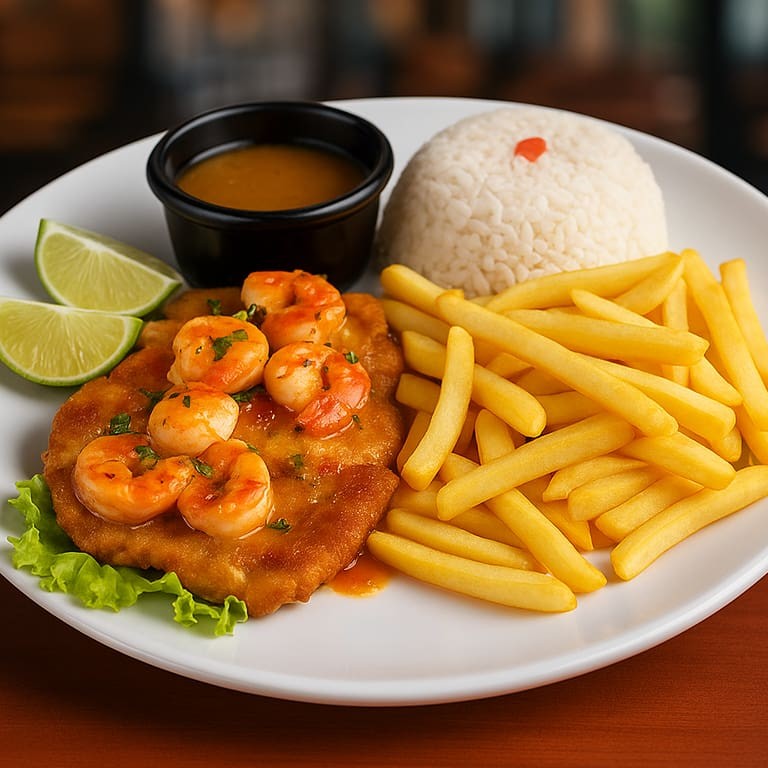 Acompanha : Arroz , Pirão Peixe Ou Feijão, Fritas , Salada De Alface E Tomate , Filé De Peixe Com Molho De Camarão.