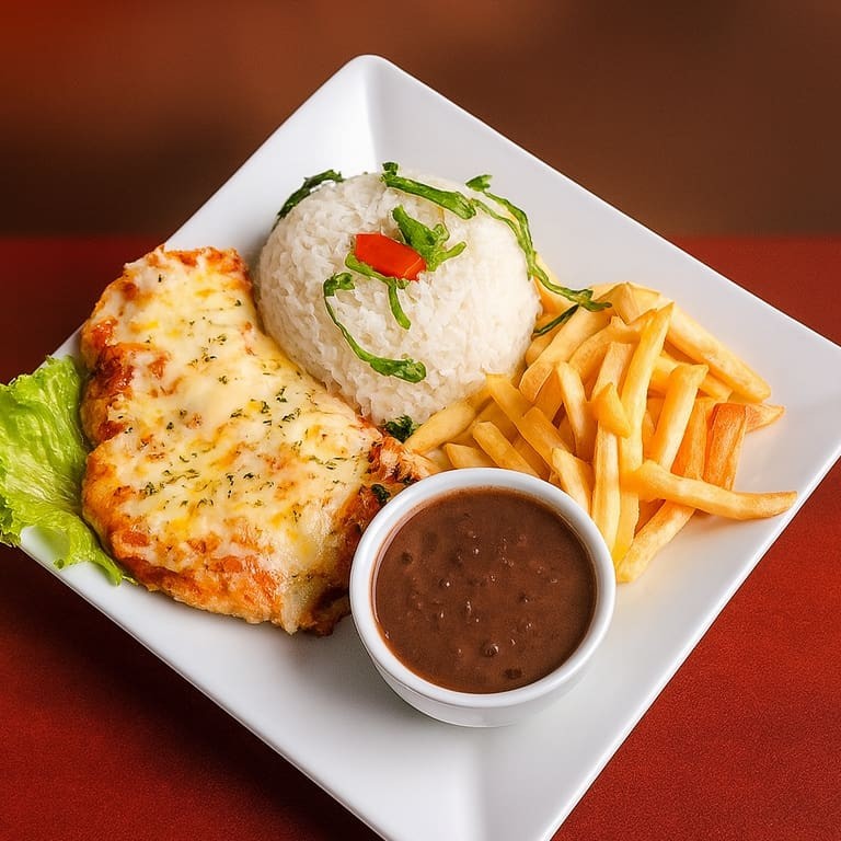 Deliciosa Parmegiana Com Molho Da Casa , Marmitex 750ml. Acompanha : Arroz , Feijão , Fritas , Alface Tomate , 1 Bife De Carne A Parmegiana.