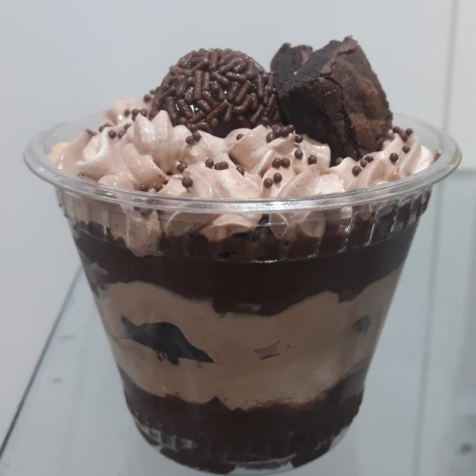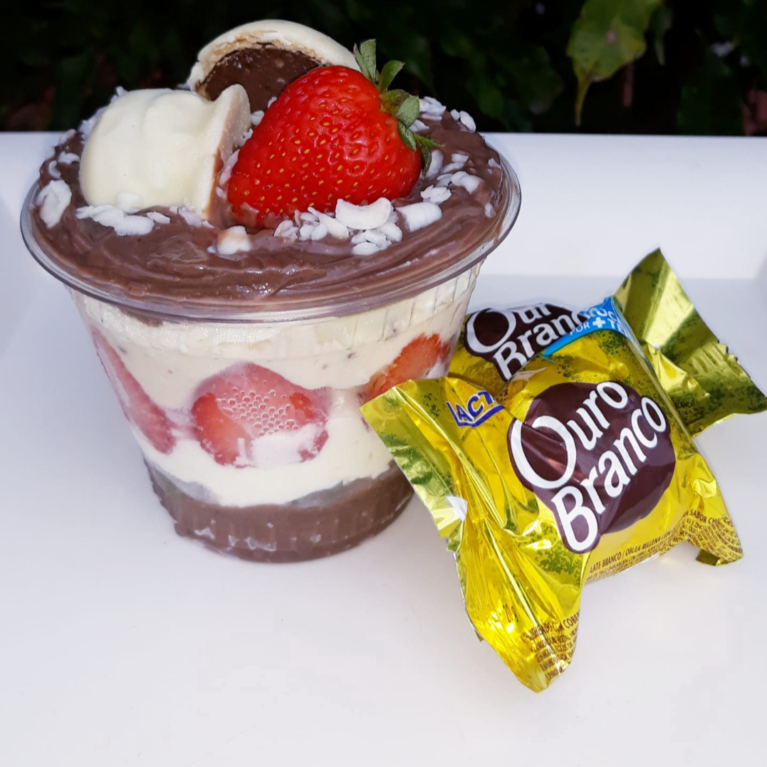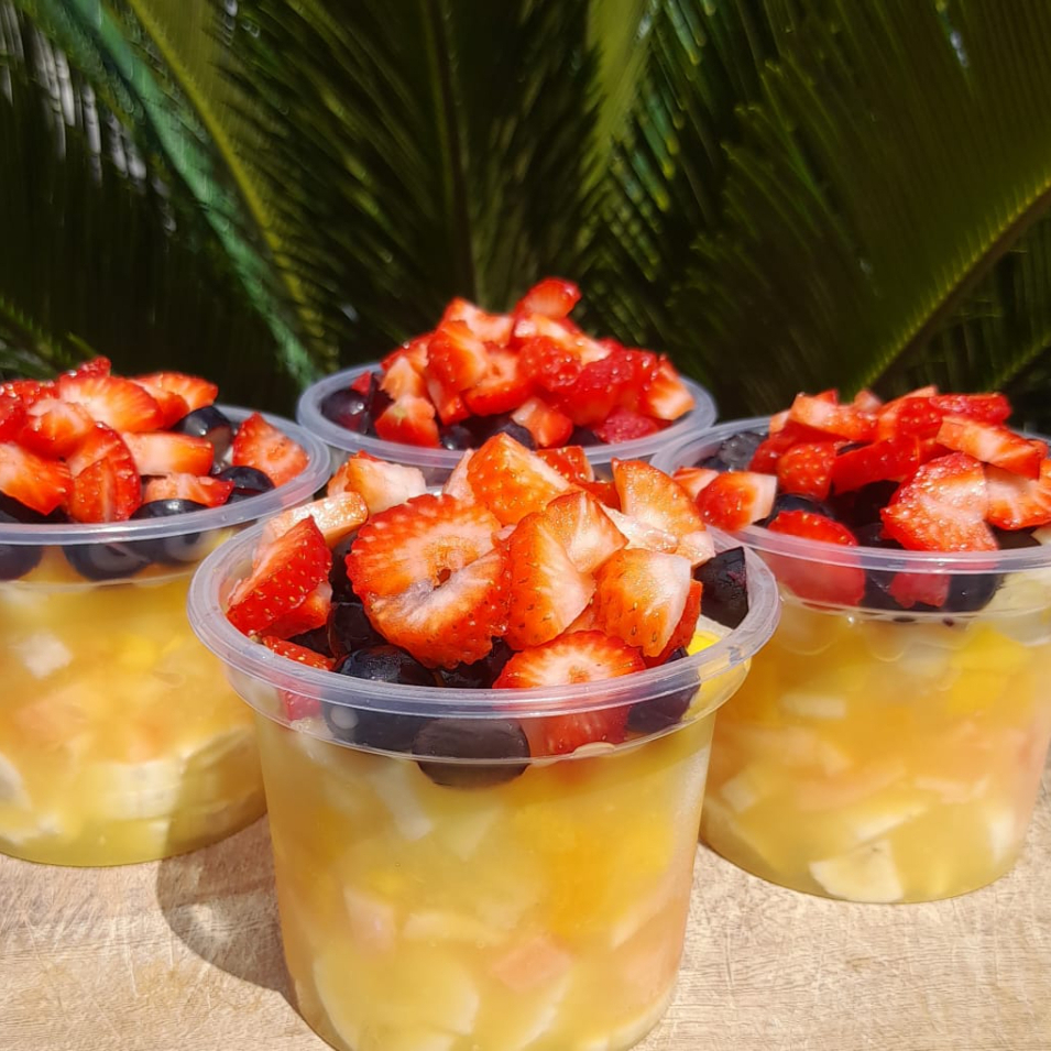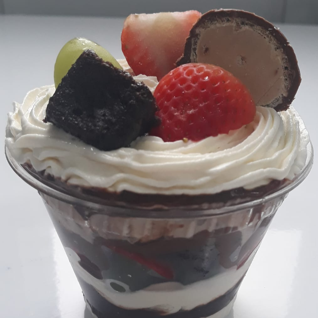 Com 3 frutas ( Morango, Banana, e Uva ) + Marshmallow, Brownie + Ganache ( no pote separado )