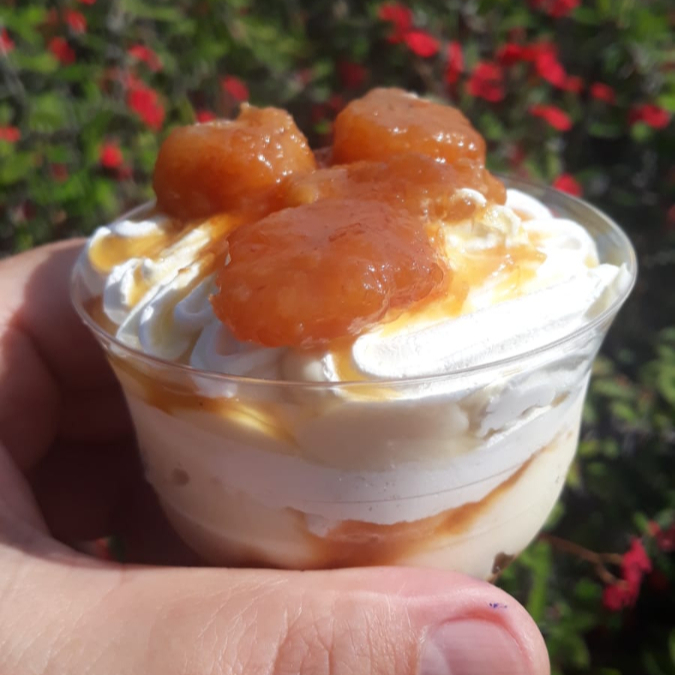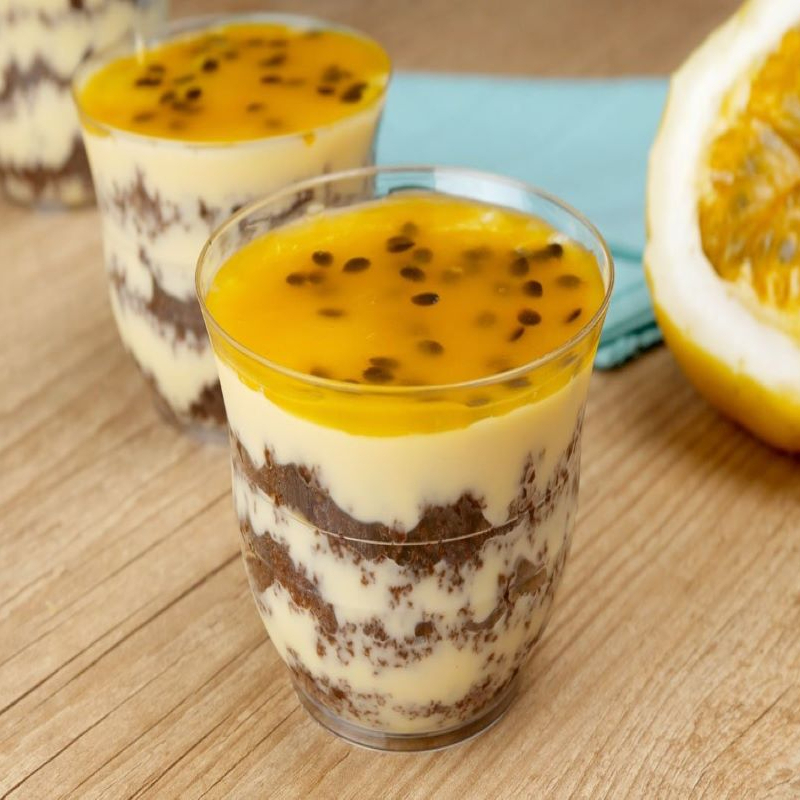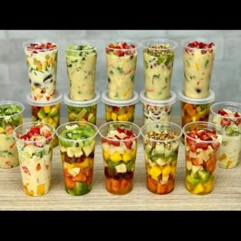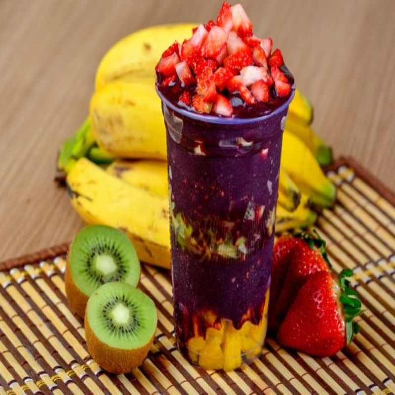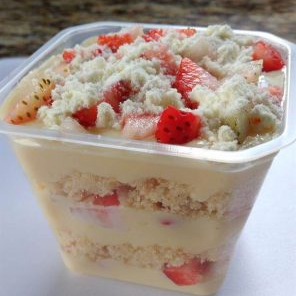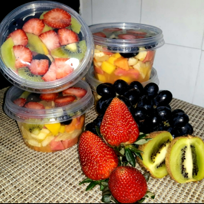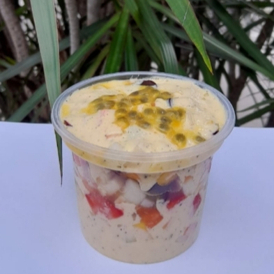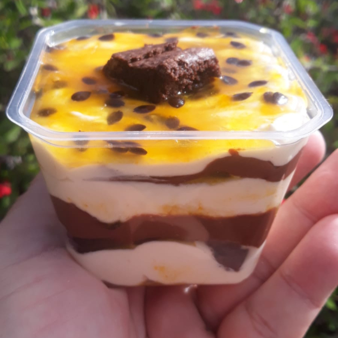 Com 3 frutas ( Morango, Banana, e Uva ) + Marshmallow, Brownie + Ganache ( no pote separado )