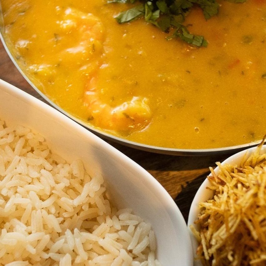 Delicioso Bobó de Camarão, um prato principal que serve de 3 pessoas. Este prato é formado por uma combinação sublime de camarões suculentos, cuidadosamente envoltos em um creme de mandioca rico e aveludado. Para completar, é acompanhado por um arroz branco delicadamente temperado e uma batata palha crocante e dourada. Uma autêntica experiência gastronômica brasileira, apresentando sabores intensos e texturas variadas que agradam até os paladares mais exigentes.