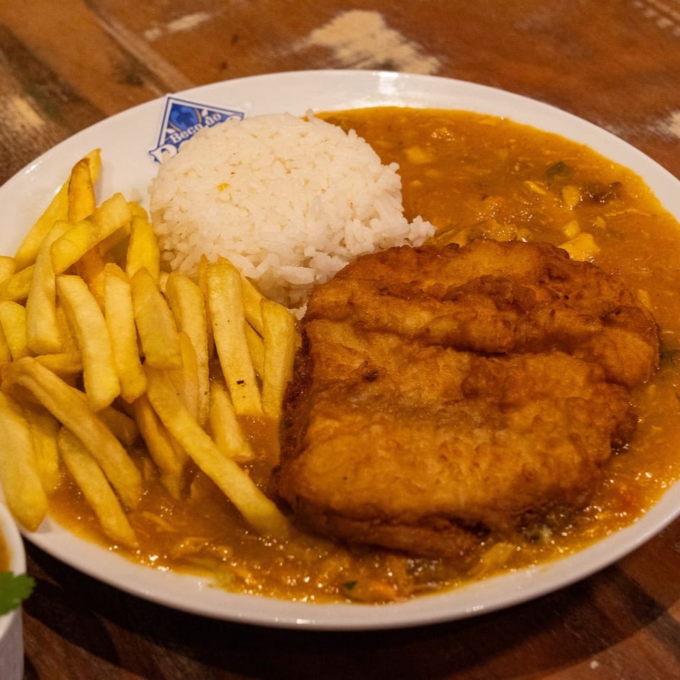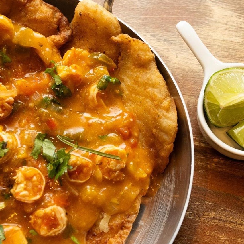 Peixe Frito* Filé de peixe com molho de camarão, Acompanhado de Arroz,Pirao e Fritas
