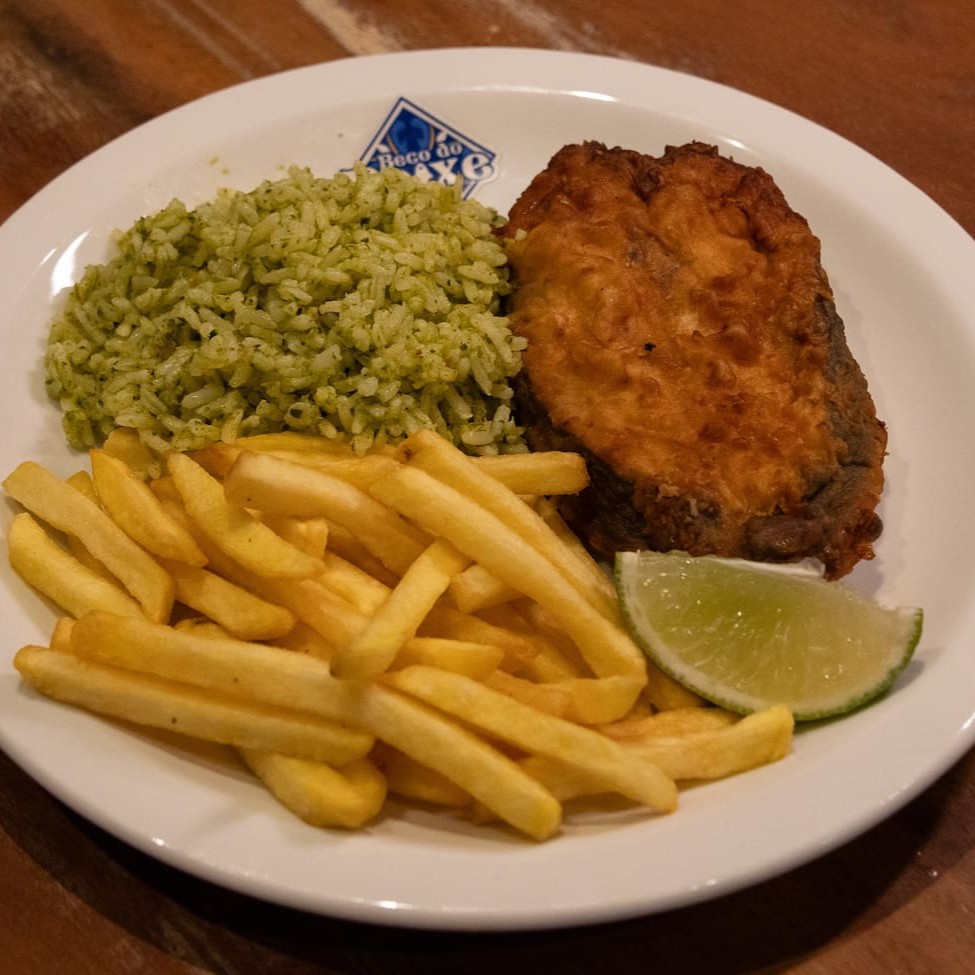 Peixe Frito* Filé de peixe acompanhado de arroz, pirão e salada verde