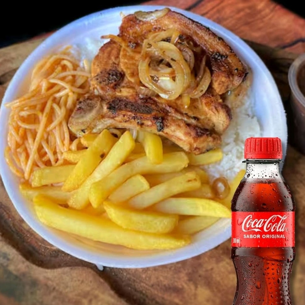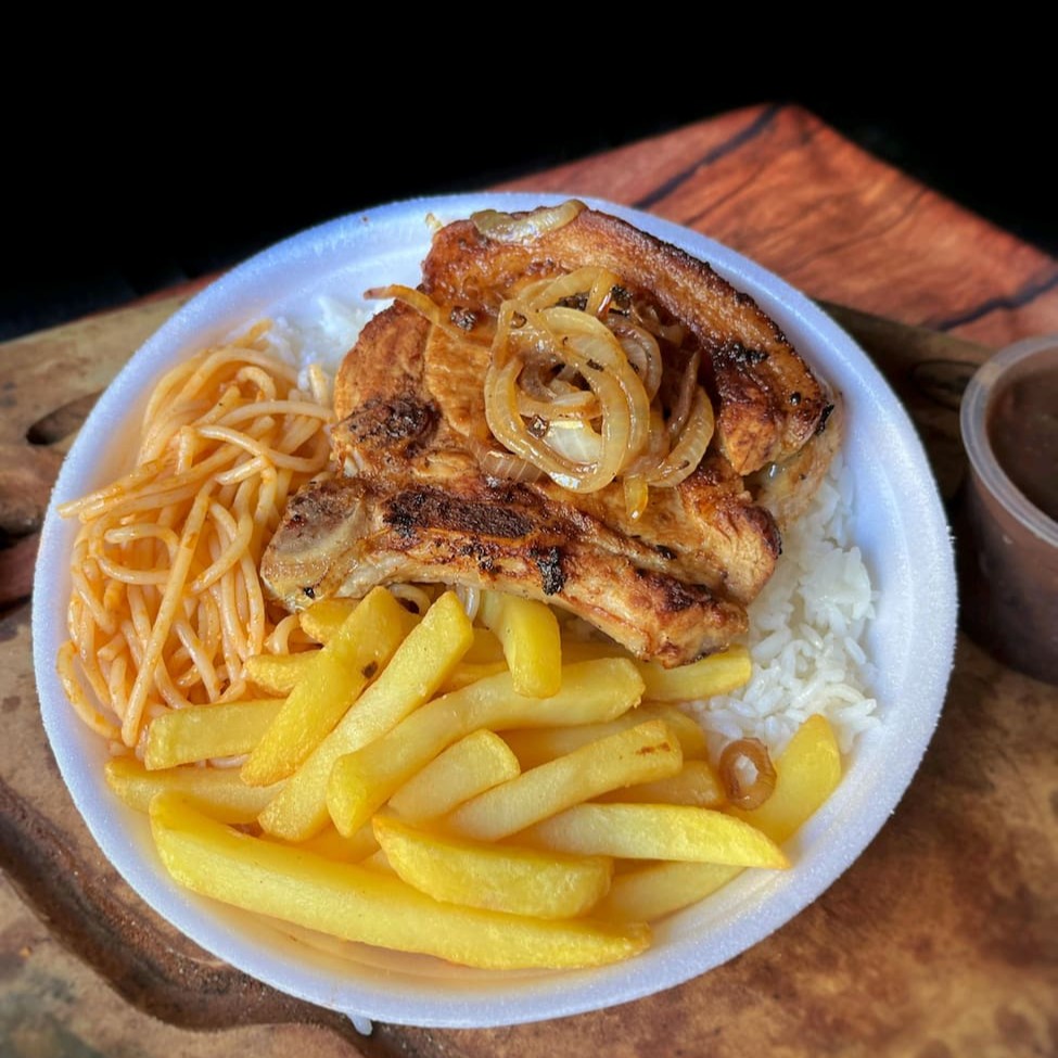 Acompanha arroz, macarrão, feijão fresquinho, farofa e batata frita.