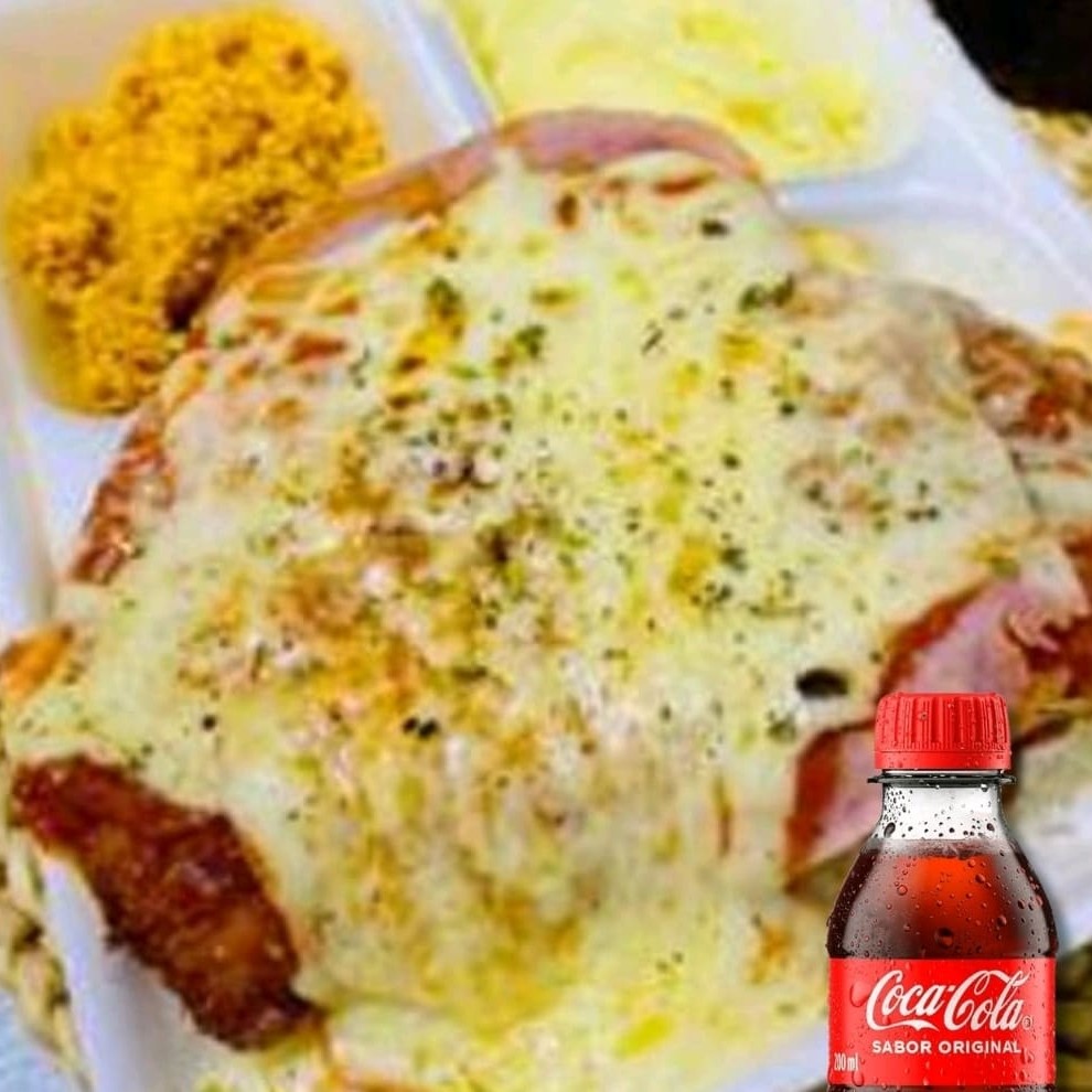 Delicioso bife empanado com molho de tomate queijo e presunto, arroz, feijão, purê ou aipim e salada verde. (Aprox 500gr )