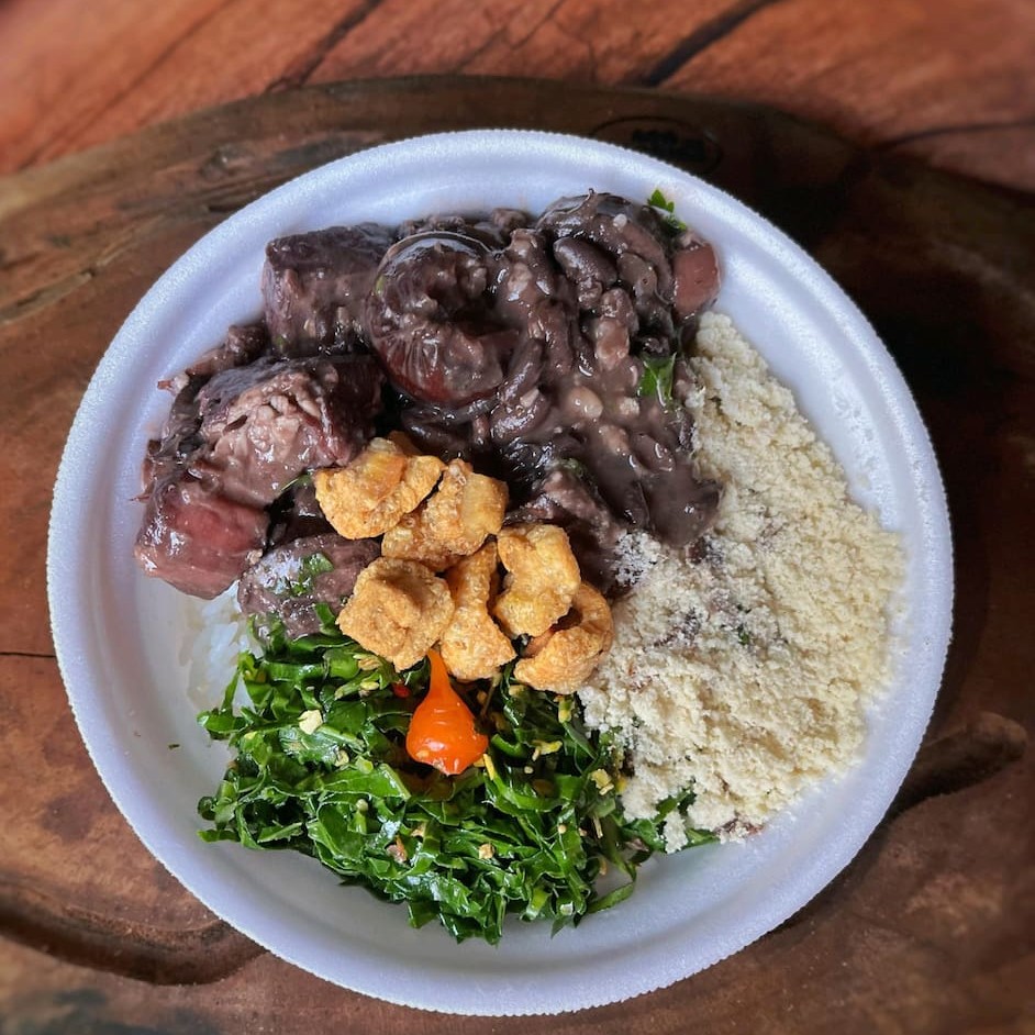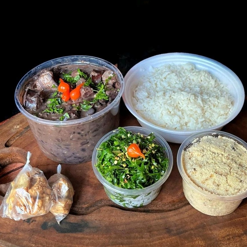 Feijoada bem temperada, calabresa, carne seca, lombo, costelinha e baycon Arroz branco, couve mineira, farofa, torresmo.