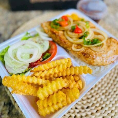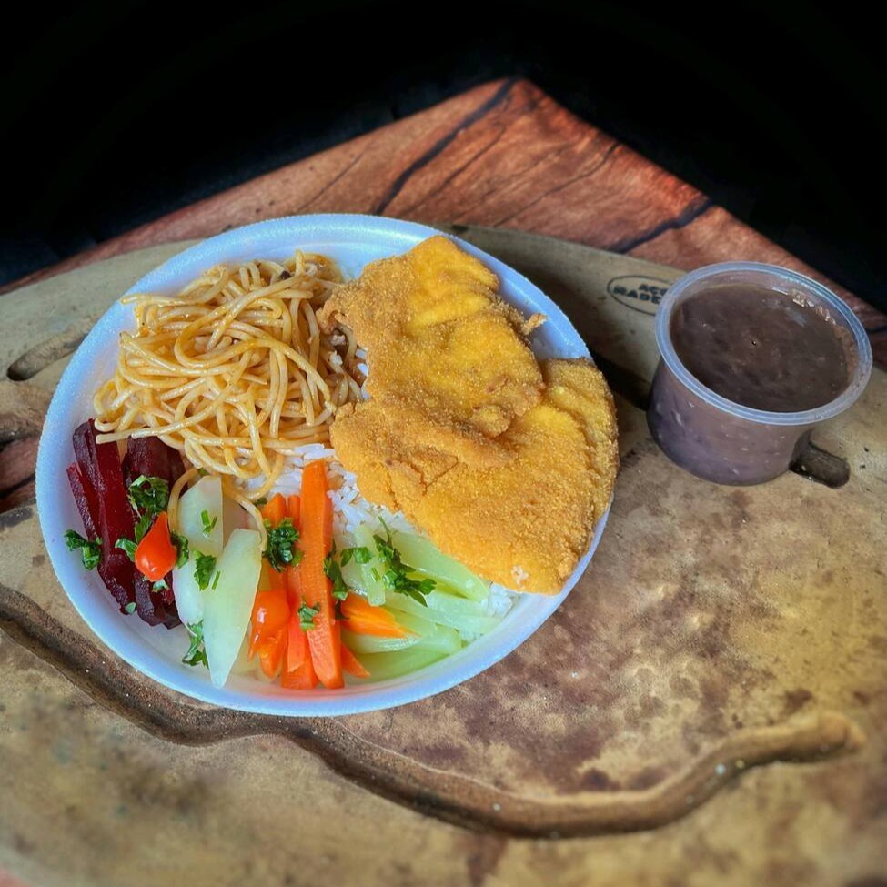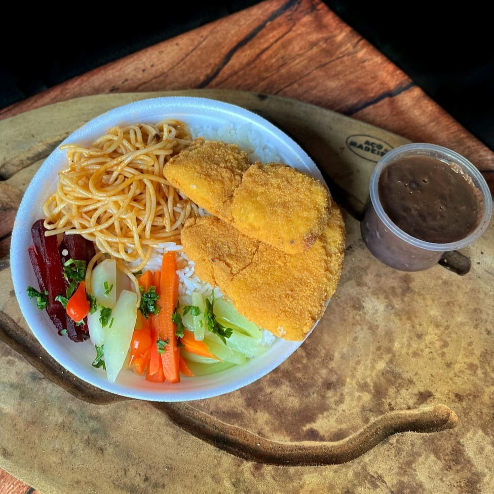 File de peixe empanado, macarrão, arroz branco, feijão temperadinho, fritas, purê ou aipim e salada verde. ( Aprox 500gr )