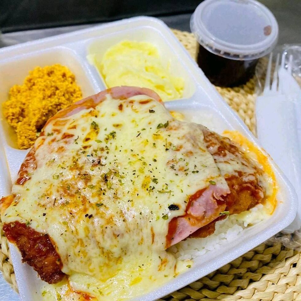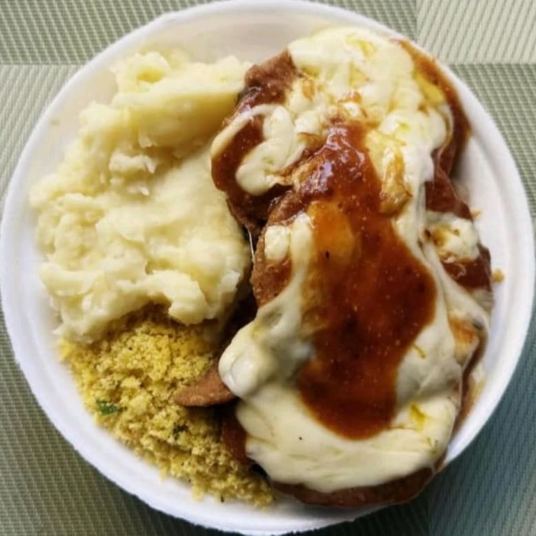 Suculenta parmegiana de frango com molho especial de tomate, presunto e queijo, arroz branco, feijão temperadinho, purê de batata com queijo e salada de alface.