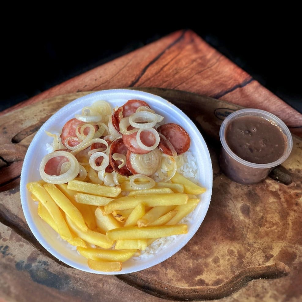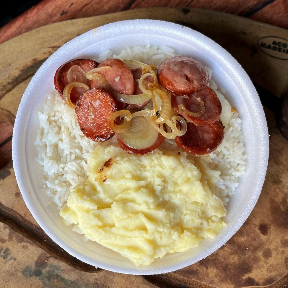 Acompanha arroz, feijão, purê de batata, aipim ou fritas, calabresa acebolada