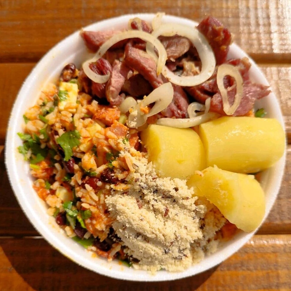Quentinha de baião de dois acompanhado de carne de sol acebolada e aipim cozido regado na manteiga de garrafa com queijo coalho. Quentinha sugerida para 1 pessoa com aproximadamente 750gr de comida.