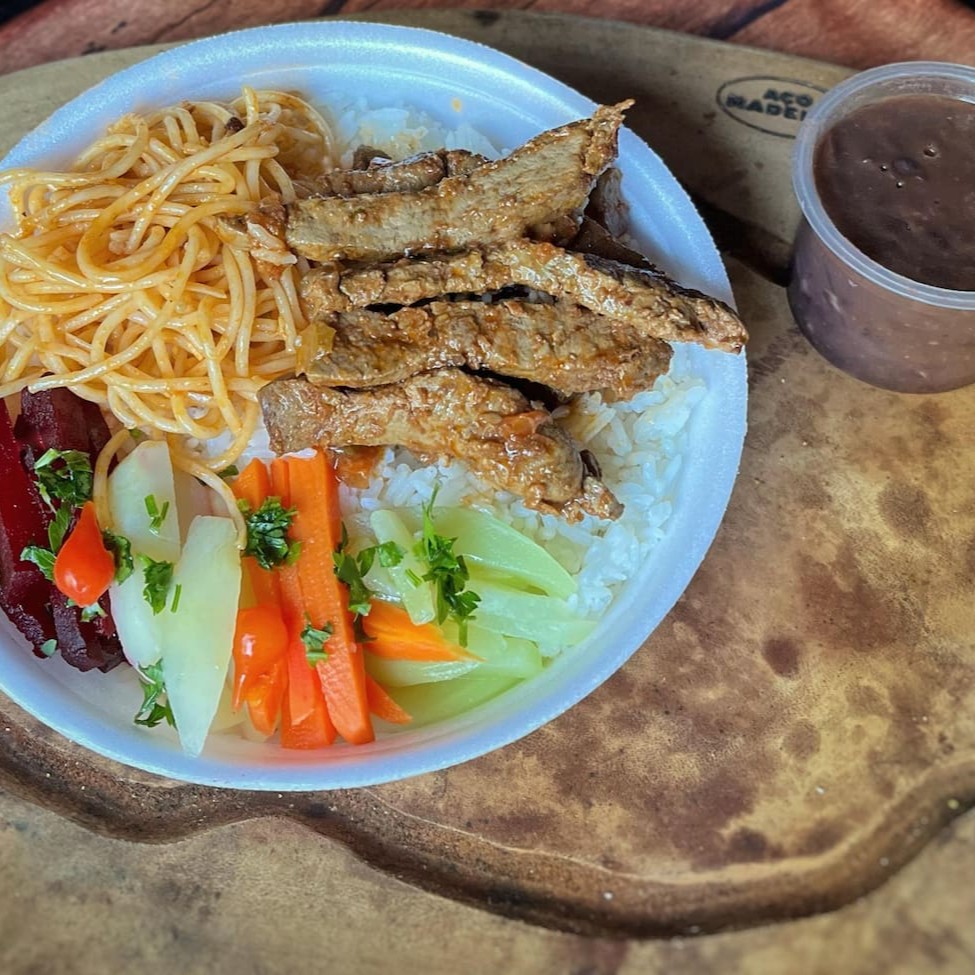 Quentinha carre acebolado, arroz branco, macarrão, feijão temperadinho, fritas, purê ou aipim e salada verde. ( Aprox 500gr )