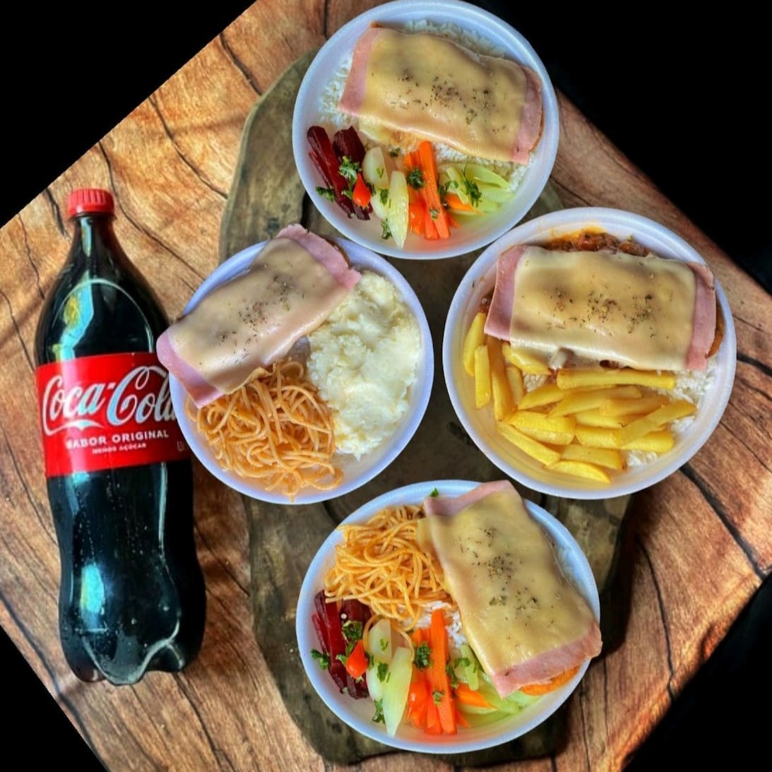 Acompanha arroz, macarrão, feijão fresquinho, farofa e purê de batata com queijo ou aipim.