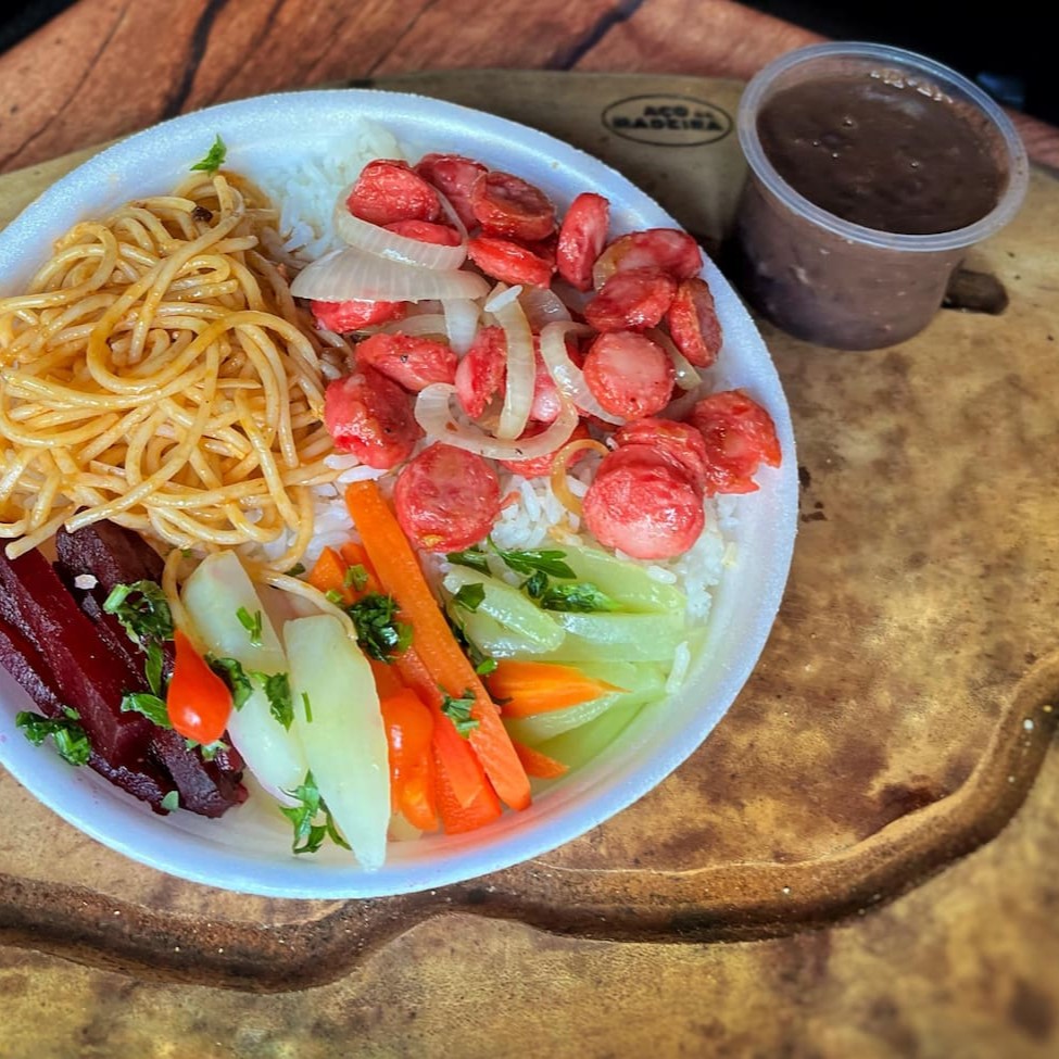 Quentinha arroz, feijão, salada verde, purê de batata, aipim ou fritas e Linguiça acebolada.