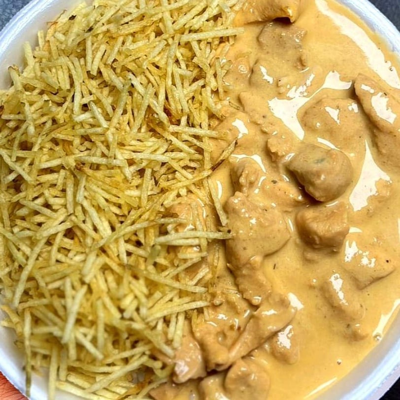 Strogonoff carne de alcatra, arroz, batata palha.( Aprox 500gr )