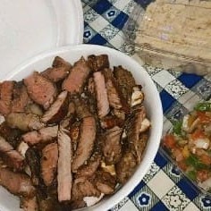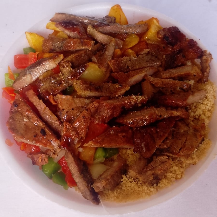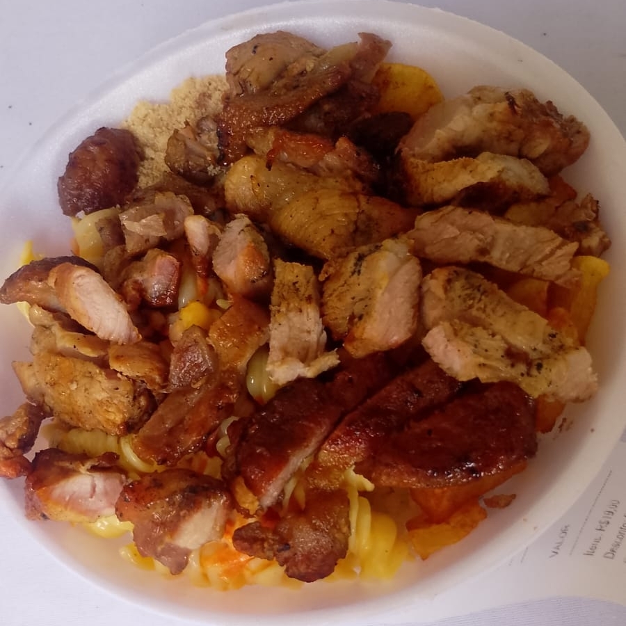 1 PORÇÃO G CHURRASCO MISTO, 1 POTE DE VINAGRETE 250ML E 1 POTE DE FAROFA 250ML.