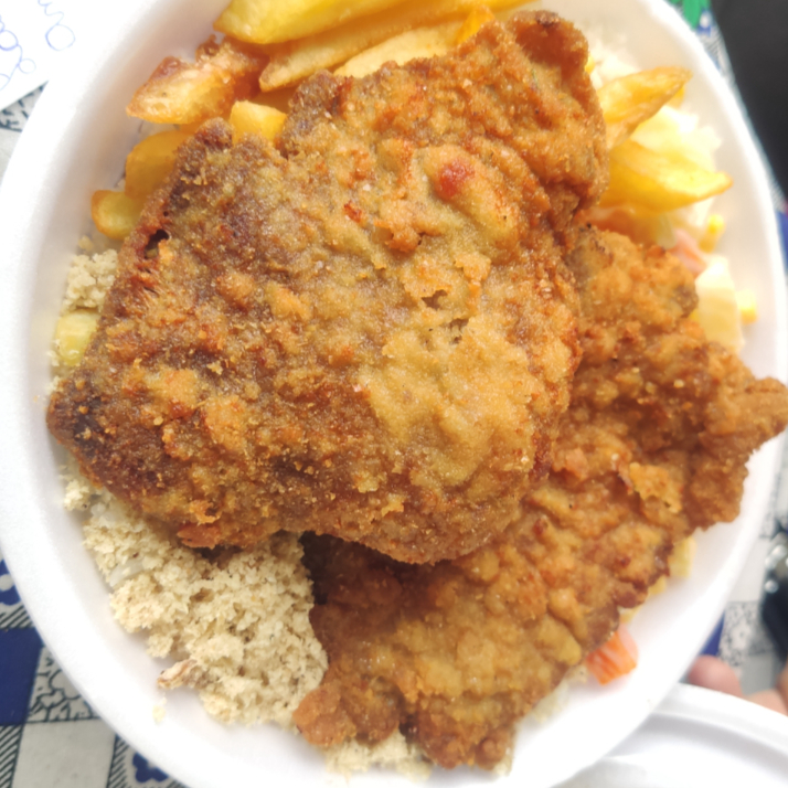 Acompanha: arroz,feijão,farofa,molho vinagrete e batata corada.