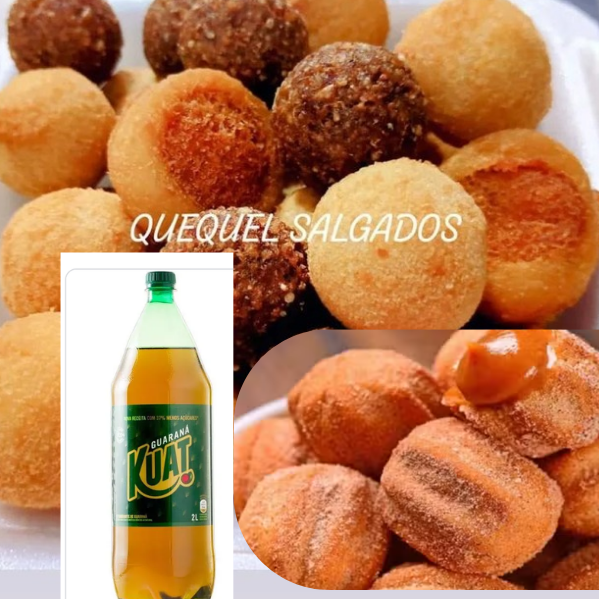 50 Salgadinhos + 15 Mini Churros + 1 Kuat 2 Lt