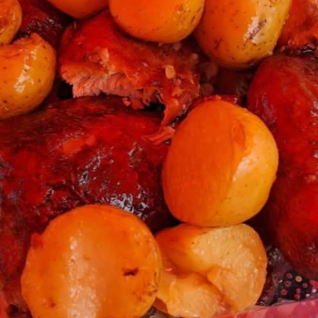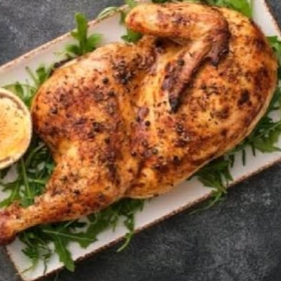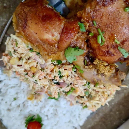 Frango na brasa com arroz, salpicão, 1 linguiça Toscana, e farofa