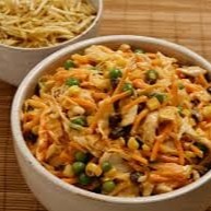 Frango desfiado com cenoura ralada, presunto, milho, ervilha, batata palha e maionese