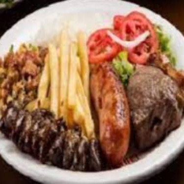 Churrasco misto com carne, frango, linguica e bacon. Acompanha arroz, feijao e farofa e batata frita.