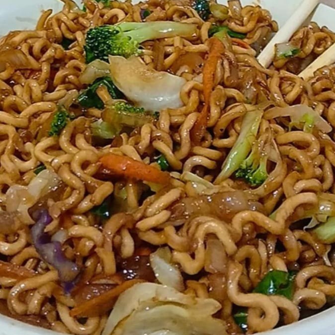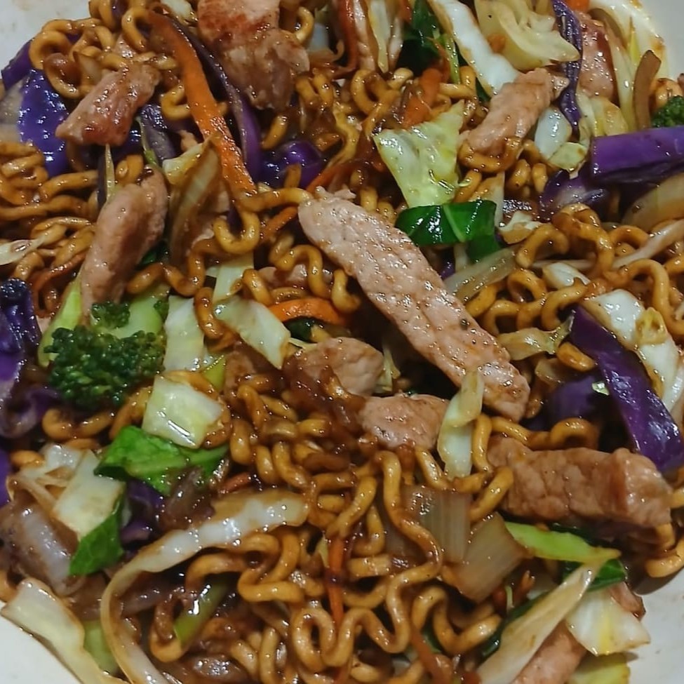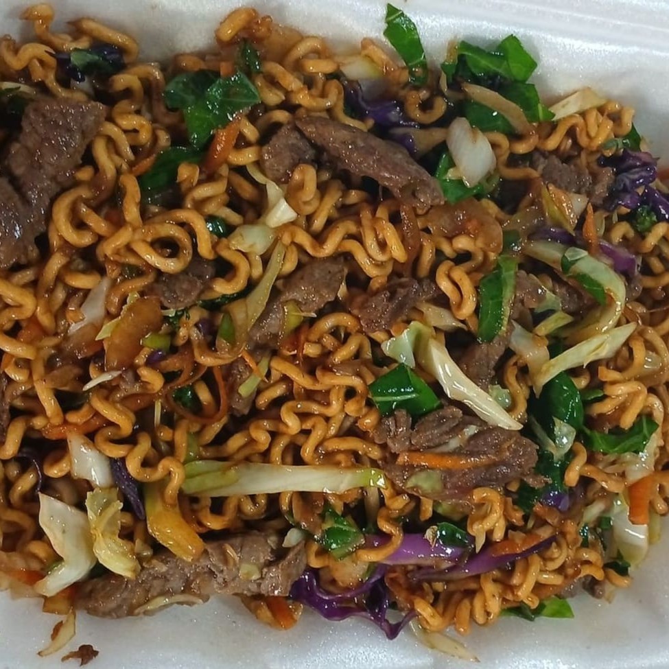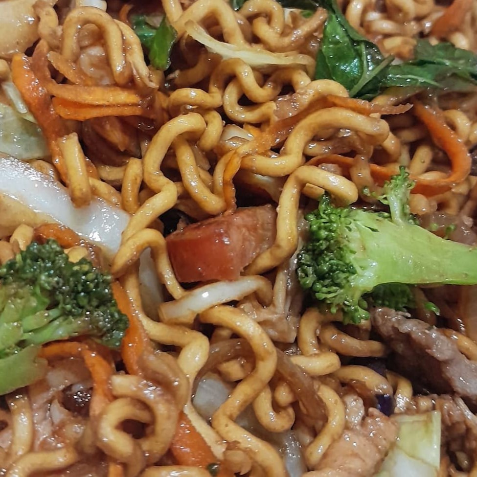 Macarrão, carne, repolho verde e roxo, cenoura, couve verde, brócolis e molho especial + shoyu.