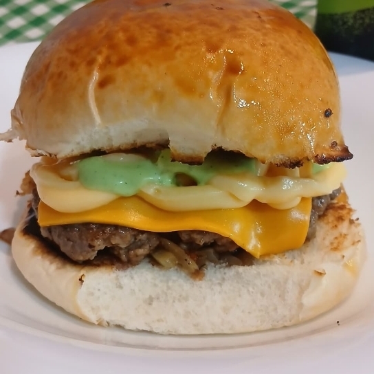 Pão fabricação própria careca, carne de alcatra (100g), queijo cheddar, bacon, barbecue, cebola na chapa e maionese verde.