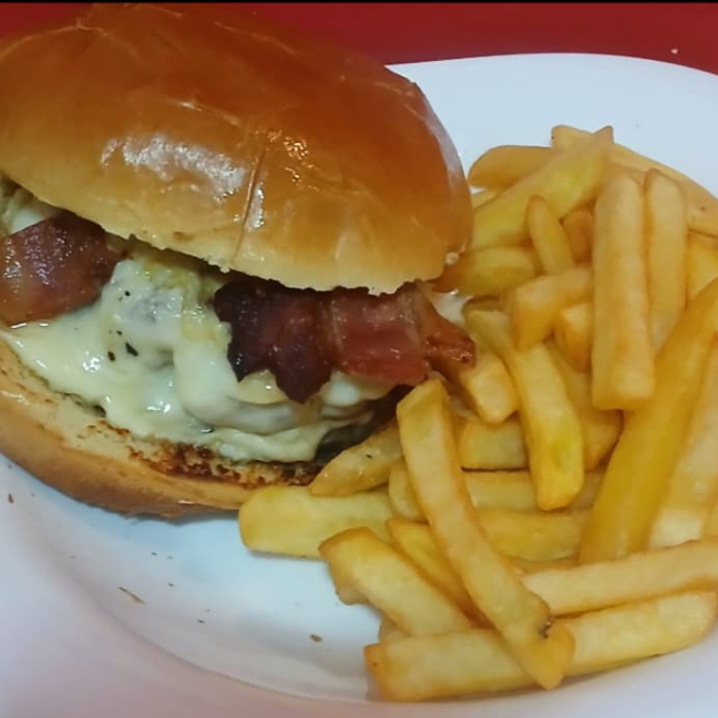 Hambúrguer artesanal feito com uma deliciosa carne de alcatra, com temperos caseiros, molho barbecue, queijo cheddar, bacon e maionese caseira. Juntamente com uma batata média crocante e sequinha.