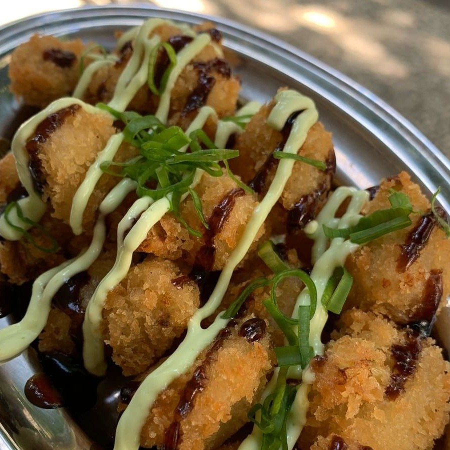Deliciosa porção de couve- flor empanada ao molho agridoce de gochujang finalizado com furikake (gergelim torrado e alga nori)