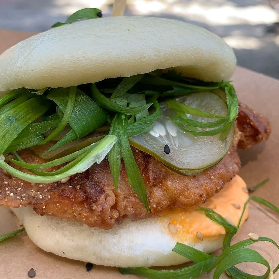 Bao aberto recheado com frango empanado, maionese suave de kimchi, picles de pepino, coentro e cebolinha
