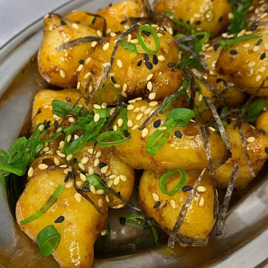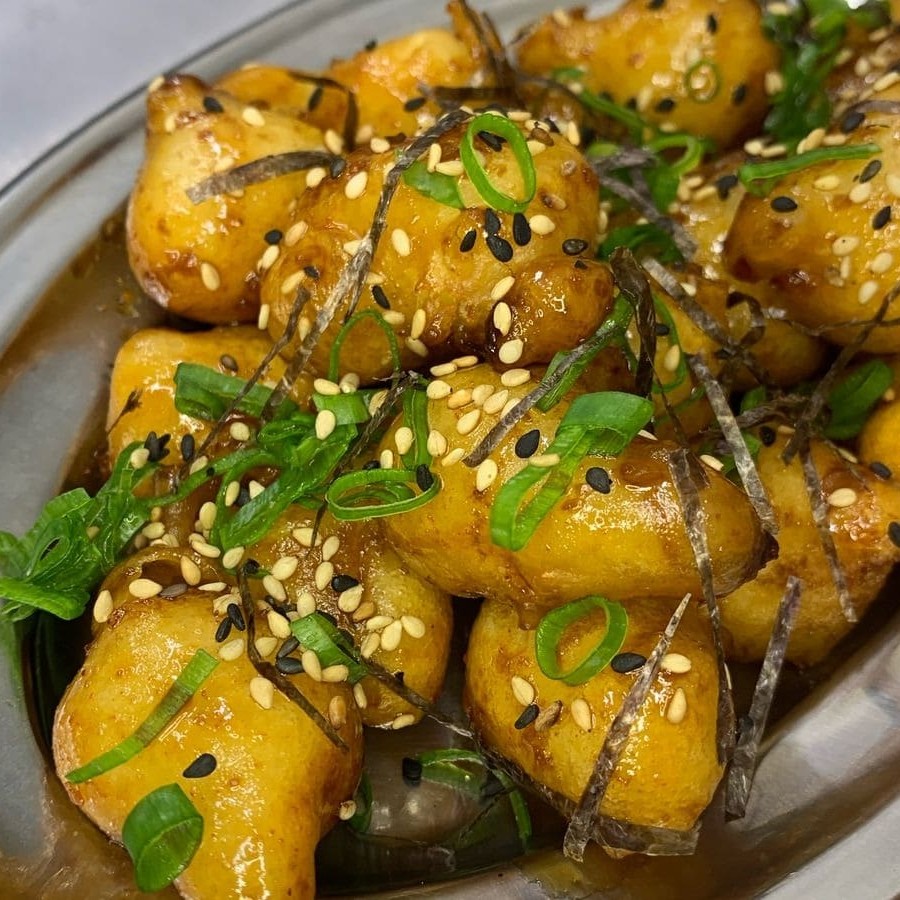 Deliciosa porção do tradicional frango empanado ao molho agridoce de gochujang finalizado com furikake (gergelim torrado e alga nori)