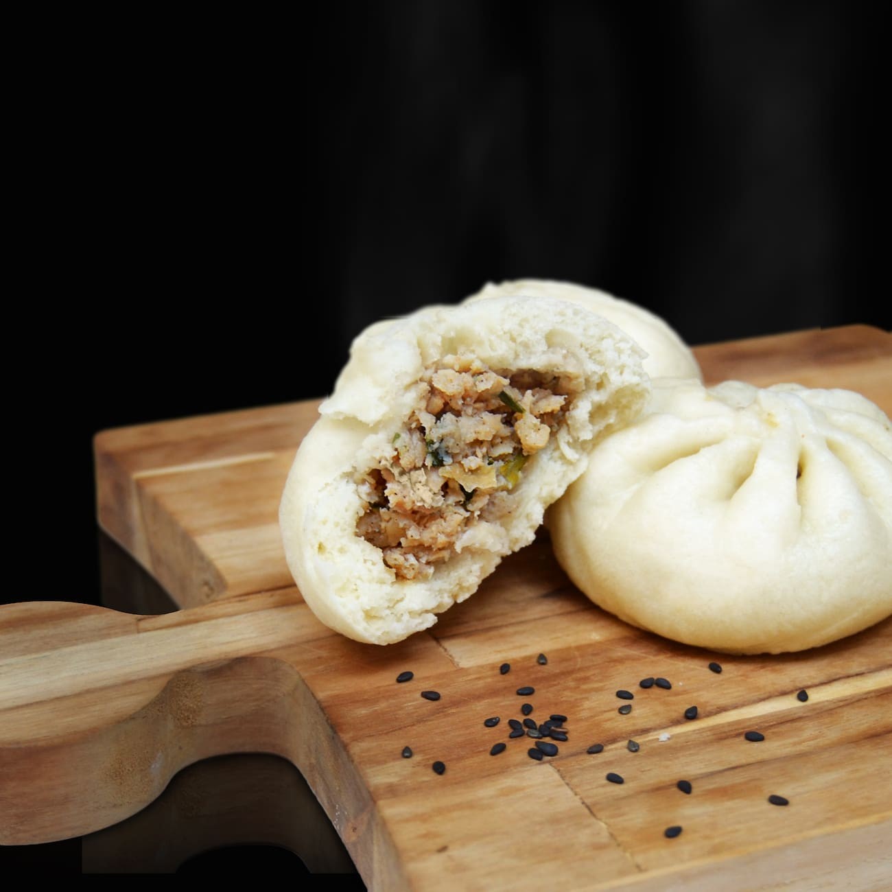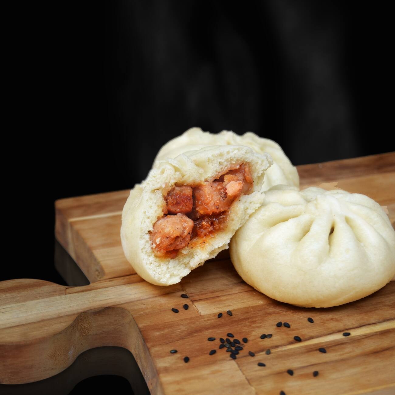 Pão chinês fofinho preparado no vapor recheado com suculentos pedaços de copa lombo marinado e assado ao molho char siu (barbecue chinês) + 1 molho à sua escolha