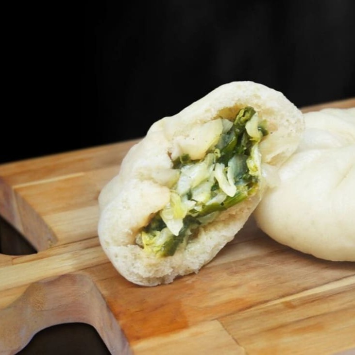 Pão chinês fofinho preparado no vapor recheado com Kimchi (acelga fermentada e pasta de pimenta) com queijo + 1 molho à sua escolha