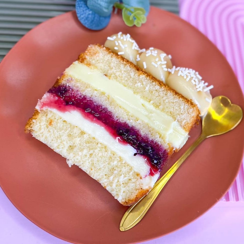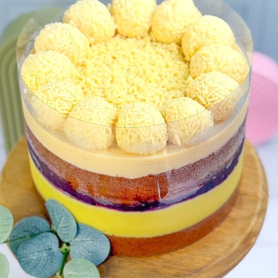 Duas camadas de massa de baunilha, recheadas com brigadeiro de limão siciliano, geleia de frutas vermelhas e brigadeiro branco. Finalizado com 12 brigadeiros de chocolate branco com confeitos de chocolate branco nobre para acompanhar cada fatia. Rendimento de 12 fatias
