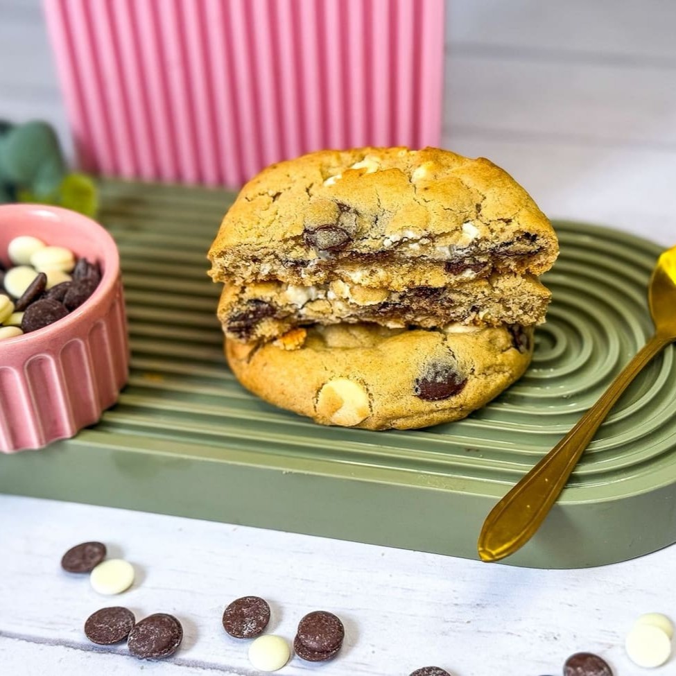 Nosso cookie estilo americano de 70g é o equilíbrio perfeito entre maciez e crocância. Feito com uma massa amanteigada no ponto ideal e gotas de chocolate meio amargo e chocolate branco. Clássico e viciante, textura perfeita e aquele sabor que conforta. #Cookieduo de 70g é a dose perfeita de #Chocolatebrancoemeioamargo! #Cookieartesanal | #Crocanteporforamaciopordentro #Feitocomamor #Docedodia