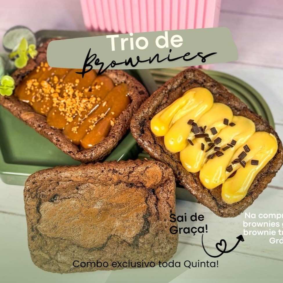 Monte seu trio escolhendo 2 entre as nossas delícias: Brownie de Caramelo Salgado Brookie (brownie com cookie) Brownie de Ninho E ainda ganhe 1 Brownie Tradicional totalmente Grátis! Perfeito para quem ama um docinho intenso e feito com afeto. Promoção válida enquanto durar o estoque! --- Tags --- #brownie #brownie artesanal #sobremesa #sobremesa na marmitinha #doce #Ninho #caramelo salgado #brookie #combo doce #leve grátis #brinde #brownie recheado