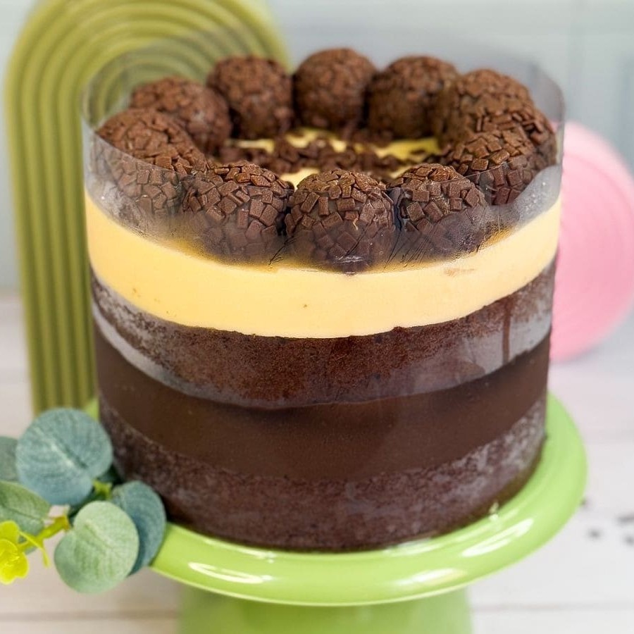 Duas camadas de massa de chocolate, recheio de brigadeiro meio amargo e brigadeiro branco. Finalizado com 12 brigadeiros ao leite com confeitos de chocolate nobre ao leite para acompanhar cada fatia. Rendimento de 12 Fatias.