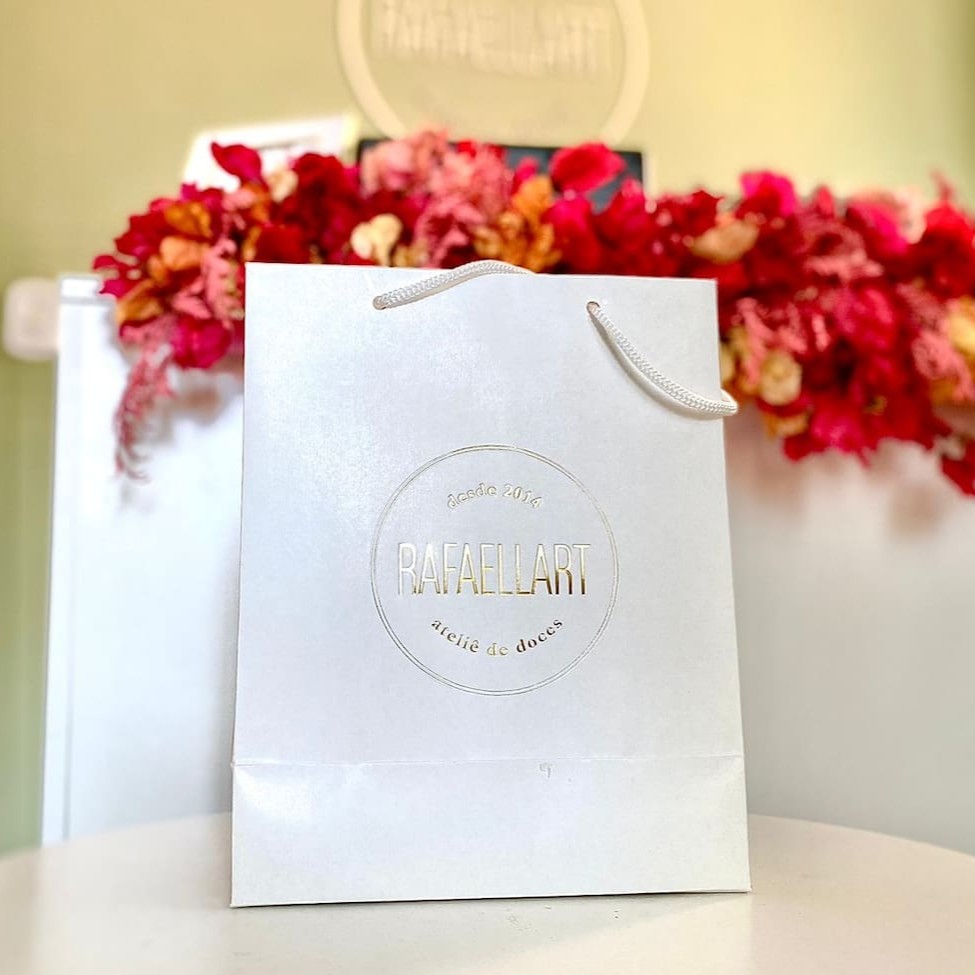 Bolsa cartonada com aplicação em hot stamping dourada da nossa Logo para presentear.