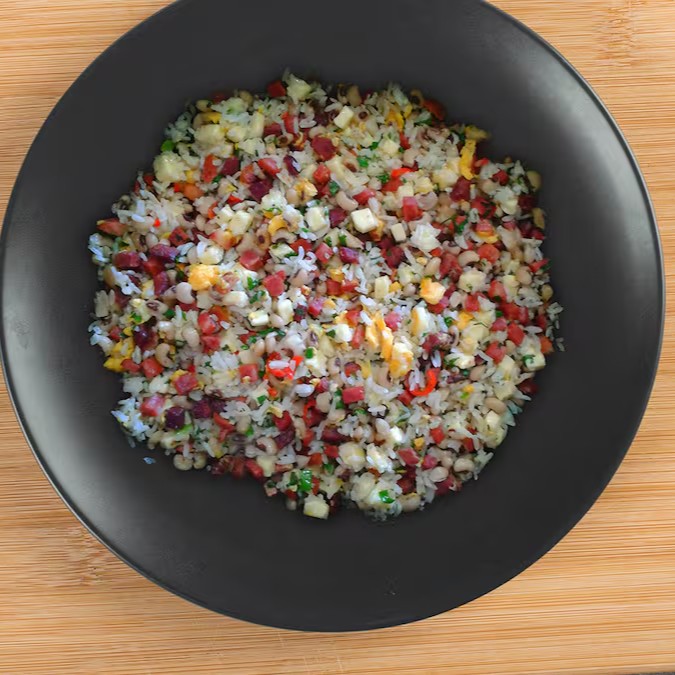 Arroz, feijão de corda, linguiça calabresa, carne seca, queijo coalho, bacon, óleo misto de soja e azeite, manteiga , coentro, alho, salsa e sal.