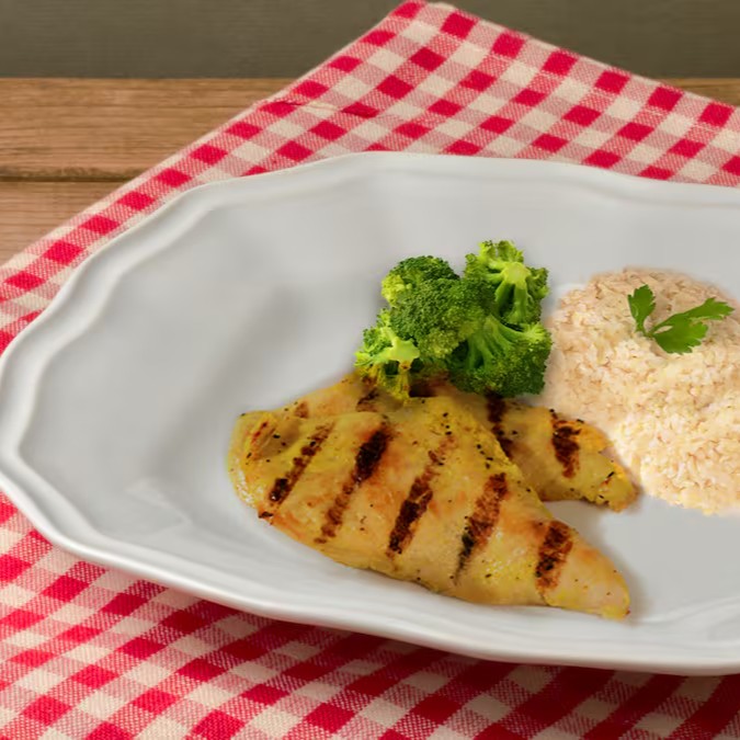 Peito de frango, arroz integral, brócolis, azeite extra virgem, alho, sal do himalaia, açafrão da terra, pimenta do reino.