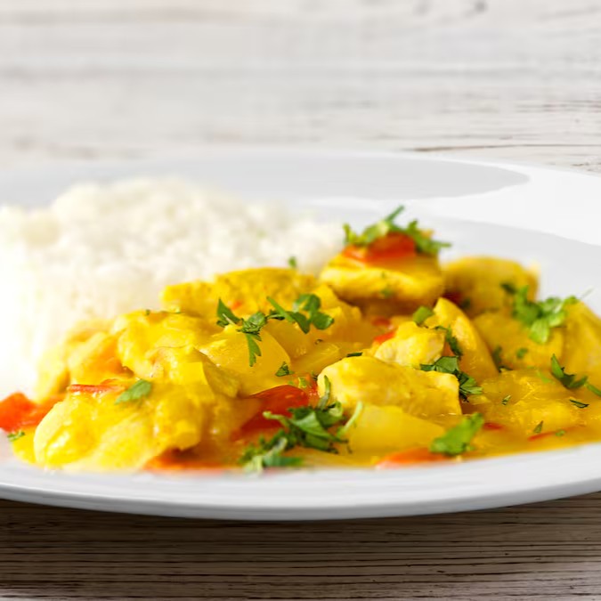 Arroz, mandioca, frango, leite de coco, leite de vaca, cebola, óleo misto de soja e azeite, manteiga, salsa, alho, pimenta do reino e sal.