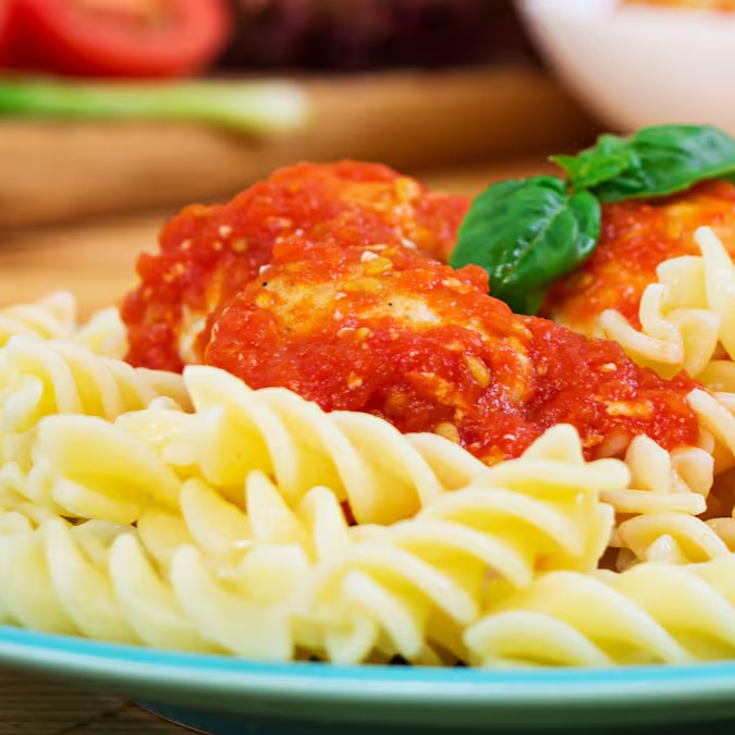 Patinho, Macarrão integral, tomate, abobrinha italiana com casca, beringela, cebola, alho, manjericão, pimenta do reino, sal do himalaia.