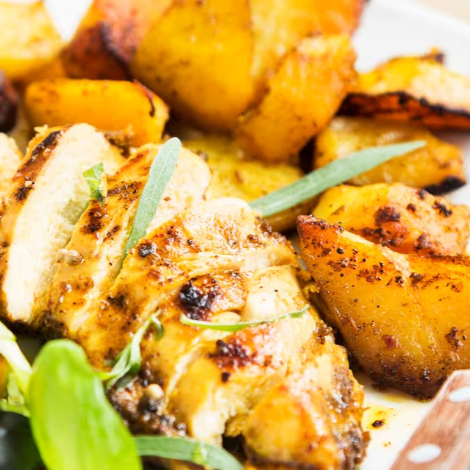 Peito de frango, batata doce com alecrim, açafrão da terra, sal do himalaia, pimenta do reino.