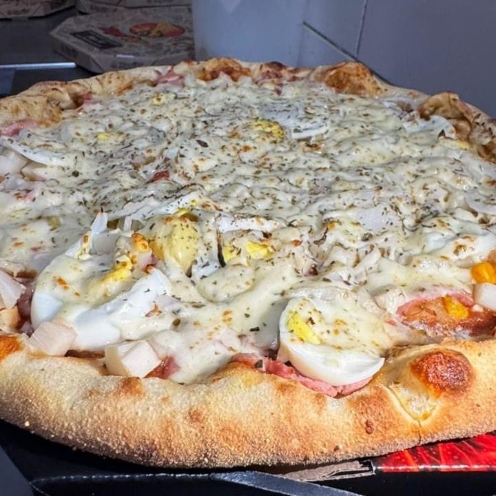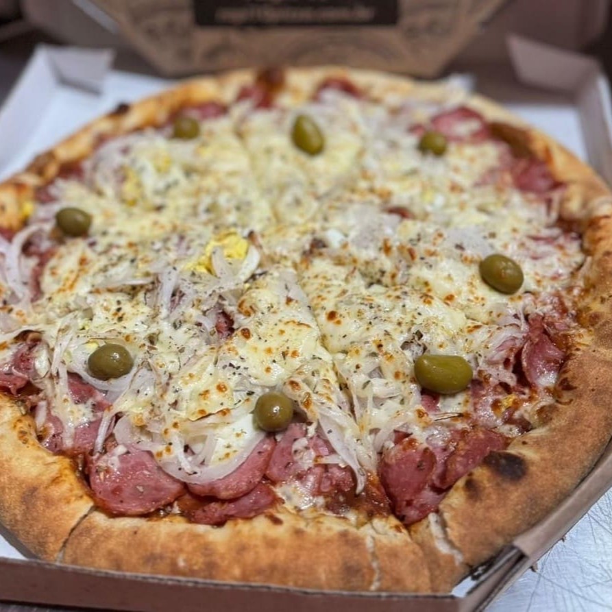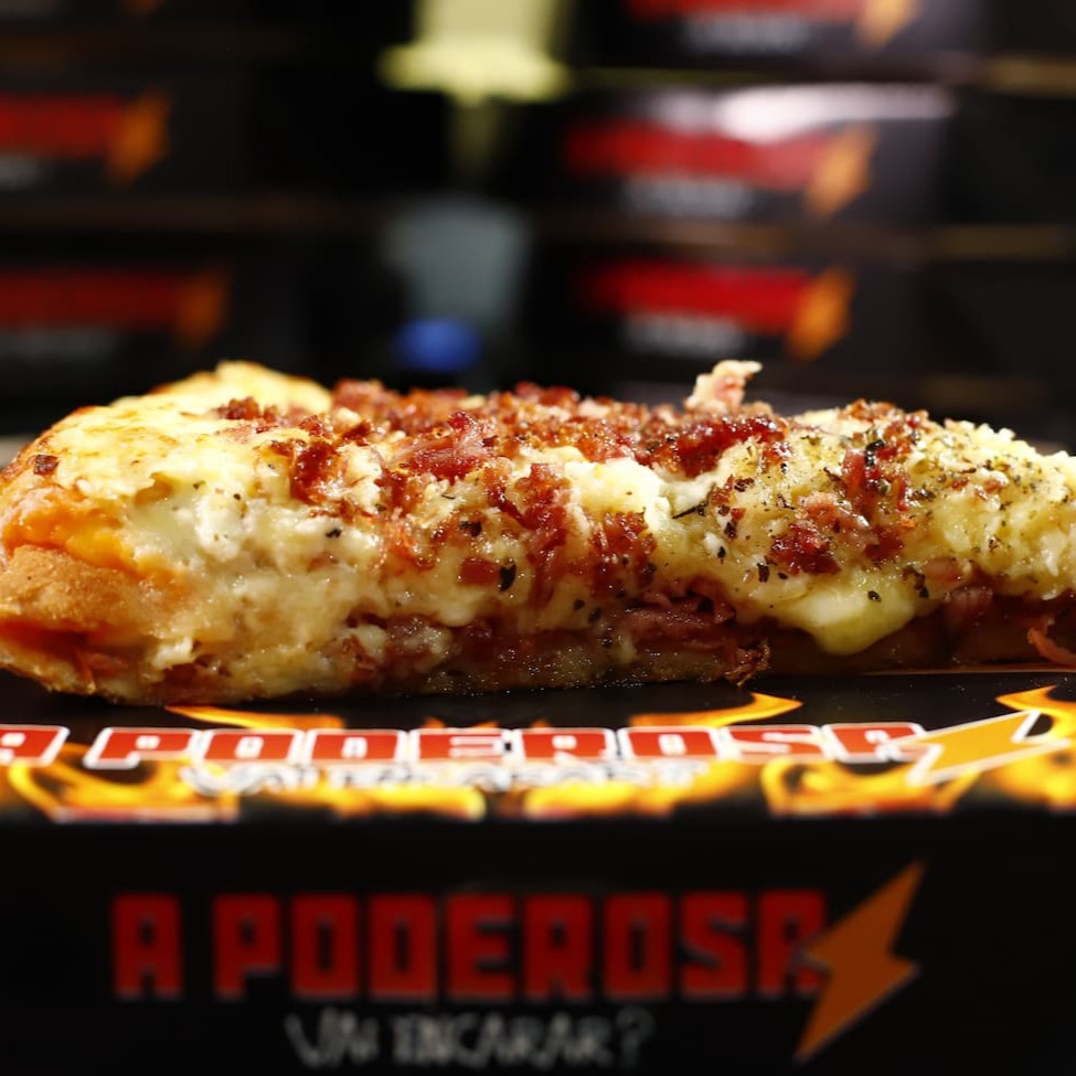 Calzone Poderosa de calabresa com um recheio maravilhoso de mussarela, milho, ervilha, presunto e bacon; por cima vai nosso molho especial, parmesão, provolone e bacon. (28 cm, 7 fatias)